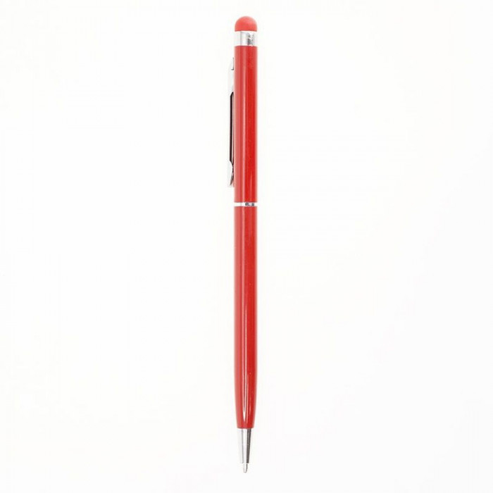 Изящная, тонкая металлическая алюминиевая шариковая ручка, цветной стилус сверху, поворотный механизм - Twist, металлический клип, покрытие корпуса - глянцевый лак, хромированная вставка сверху, хромированный носик, цвет гравировки - серебро. 140 мм.
