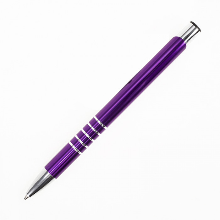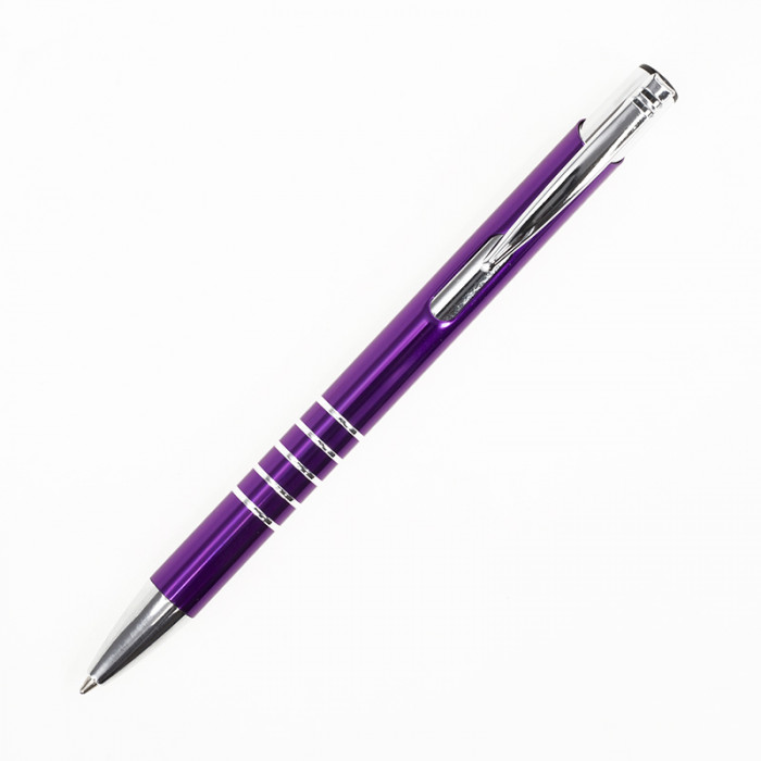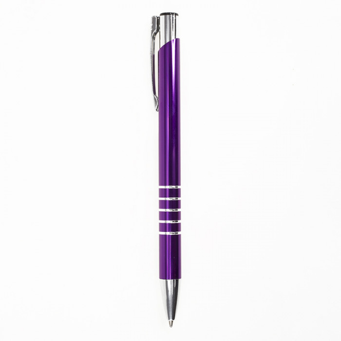 Металлическая анодированная алюминиевая ручка, кнопочный механизм, металлический хромированный клип-кнопка, 5 колец на зоне захвата, хромированный носик, цвет гравировки - серебро. 136 мм.