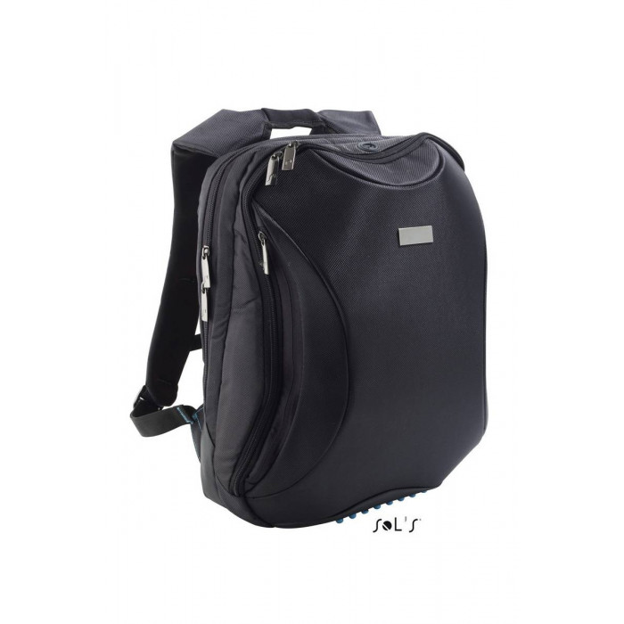Рюкзак для ноутбука из полиэстера 1680d SOL’S EQUITY. Большое центральное отделение с застежкой-молнией с двойным замком – спинка с набивкой, отверстие для телефонной гарнитуры, усиленные регулируемые лямки с набивкой, регулируемый поясной ремень, на спинке вставка из толстого поролона с сетчатой подкладкой.
