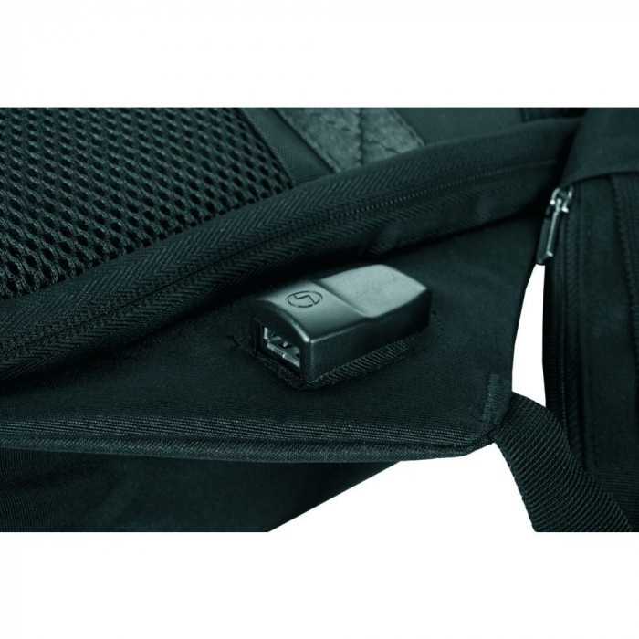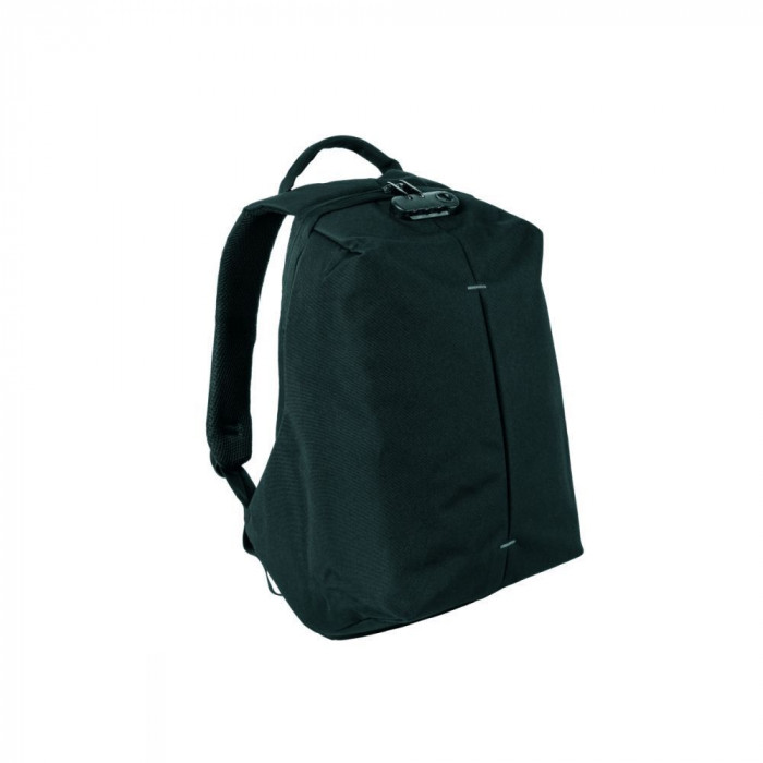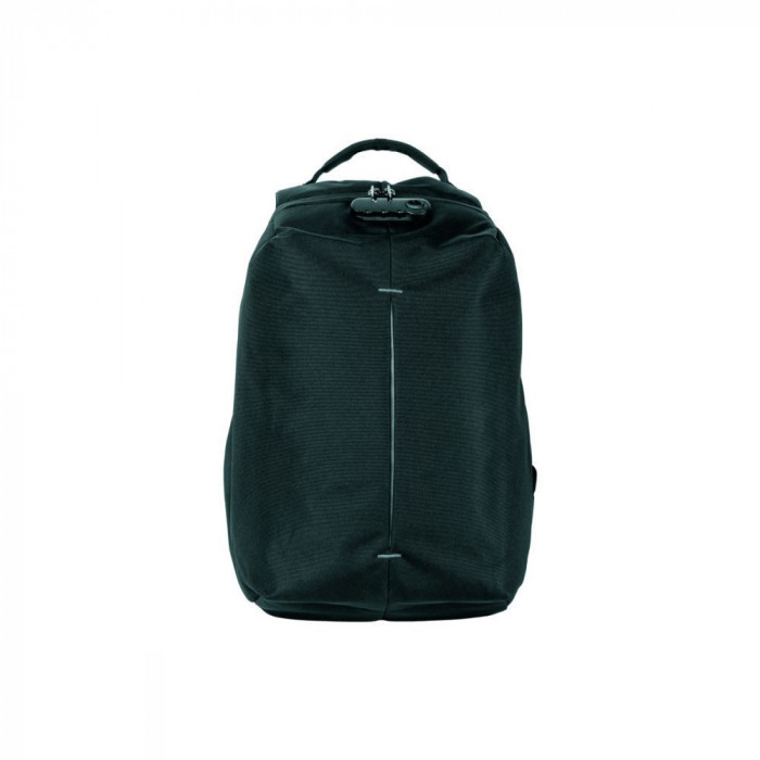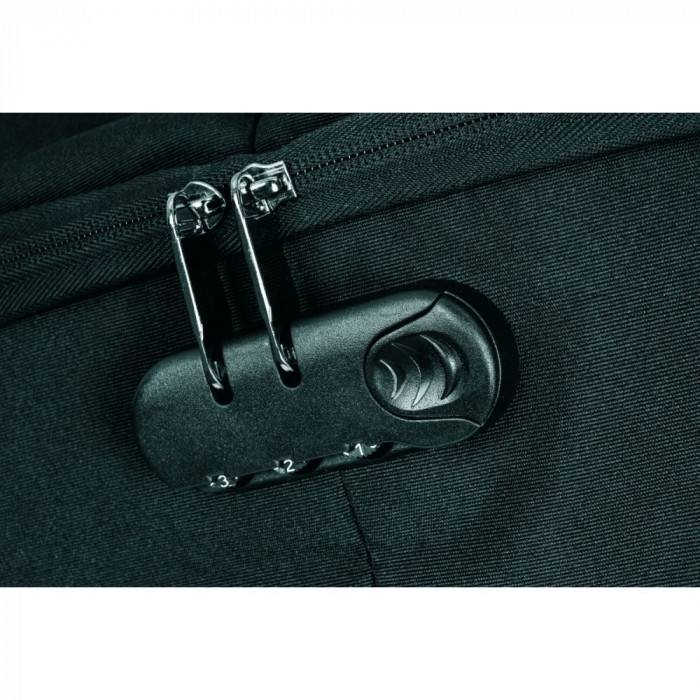 Безпечний рюкзак із захистом від крадіжки. Вхід до основної частини рюкзака звернений до вашої власної сумки, що ускладнює доступ іншим особам. Рюкзак також має замок для фіксації блискавок і потайну кишеню для платіжної картки або ключів. У внутрішній частині є м'який простір для ноутбука на 15" і планшета на 10". І вихід USB з кабелем USB також включений. Ззаду ремінь для кріплення до валізи. Лицьова поверхня оснащена світловідбиваючим аксесуаром.