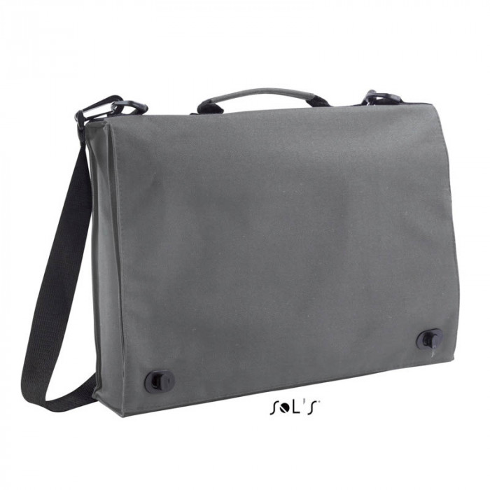 Сумка для документов из полиэстера 600d SOL’S CONFERENCE. Застежка на пуговицах, карманы и ячейки для ручек под клапаном, маленький карман на молнии в центральной части, ручка для транспортировки из нейлона, съемный и регулируемый ремень из нейлона для ношения