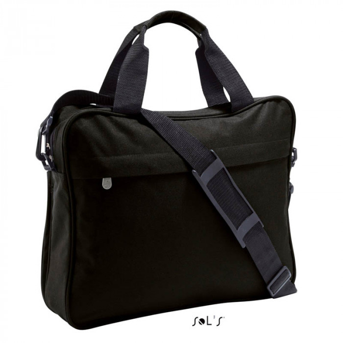 Сумка для документов из полиэстера 600d SOL’S CORPORATE. Застежка на пуговицах, карманы и ячейки для ручек под клапаном, маленький карман на молнии в центральной части, ручка для транспортировки из нейлона, съемный и регулируемый ремень из нейлона для ношения