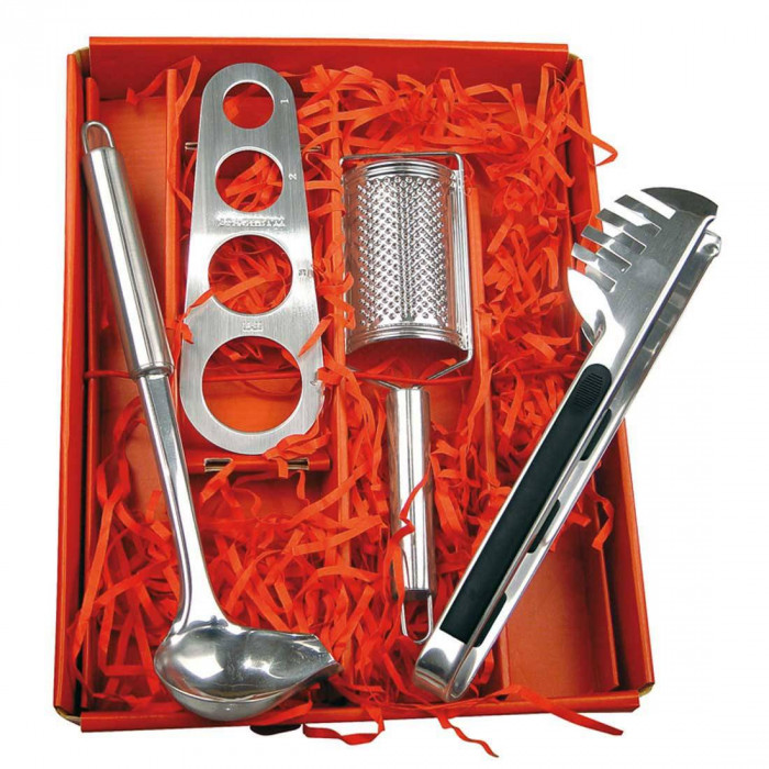 Кухонный набор для приготовления спагетти. Идеален для любителей итальянской кухни. Выполнен из высококачественной нержавеющей стали. Набор упакован в практичной, декоративной упаковке. Рекламный логотип предлагаем разместить на одном из элементов набора.