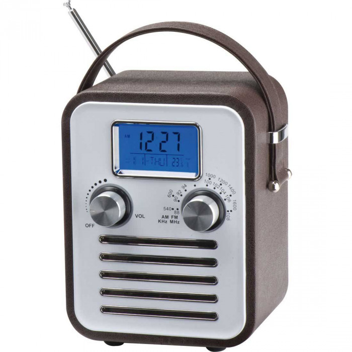 Радио, сделанное в ретро стиле с календарем, показателями температуры и функцией будильника. В комплект входит кабель для подсоединения MP3. Работает от сети