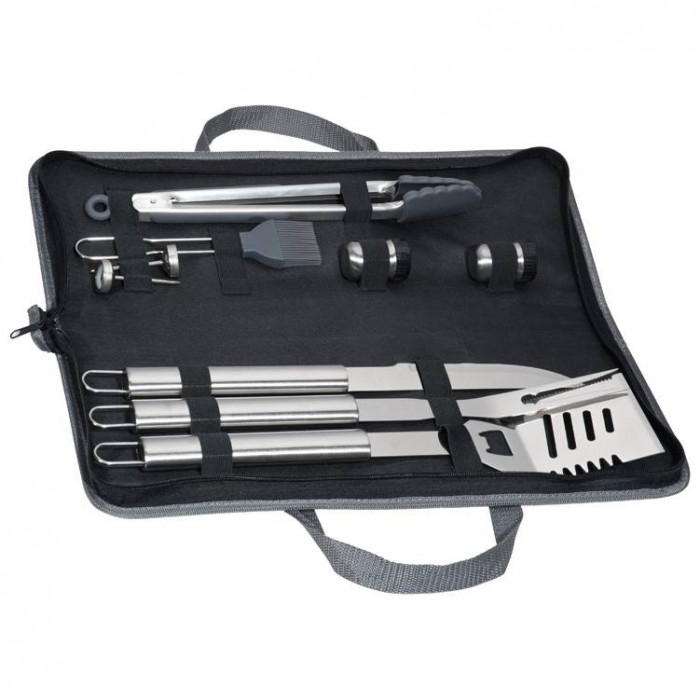 Набор содержит: лопатку для переворочивания с зубами с одной стороны, вилку, нож, щипцы, солонку и перечницу, силиконовую шётку, термометр для стейков и курицы. Группа нанесения TT2.