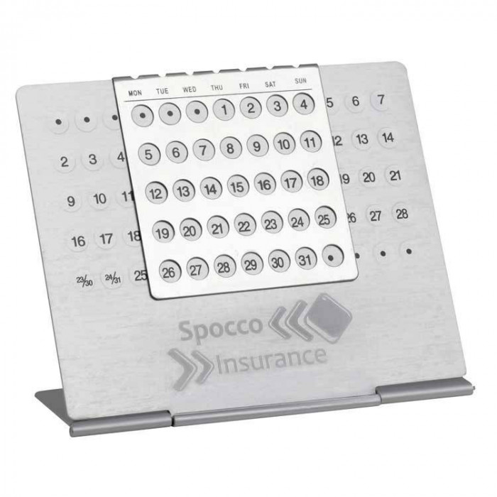 Универсальный, аллюминиевый календарь с передвигающейся пластиной. Подходит для каждого года и месяца. Устойчив благодаря подставке. Имеет также довольно большую поверхность для нанесения релкамного логотипа.