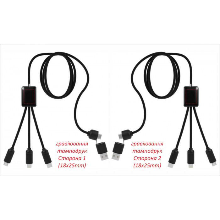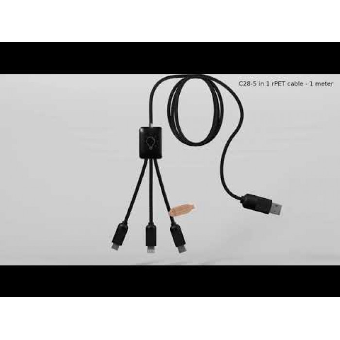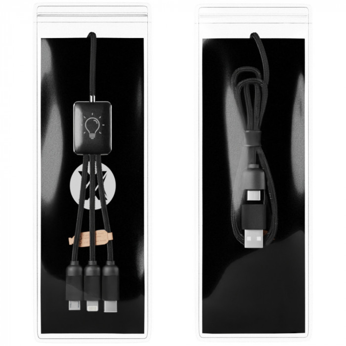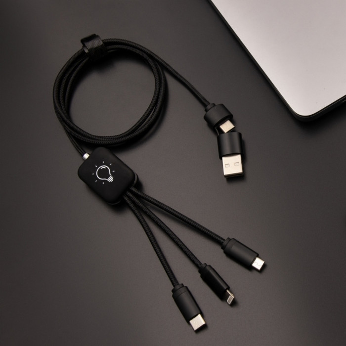 Высококачественный зарядный кабель 5-в-1 (40 W) от французского бренда SCX.design с возможностью LED гравировки. Пластикова вставка содержит белый светодиод, что позволяет подсветить выгравированные с обеих сторон логотипы. Металлические разъемы с soft-touch покрытием, поверхность кабеля из переработанного PET-пластика.