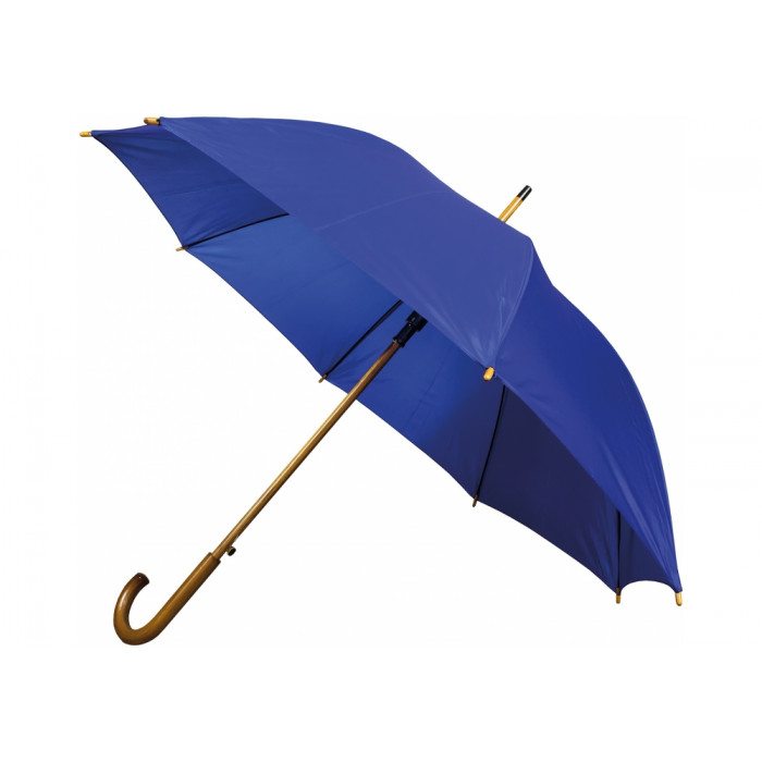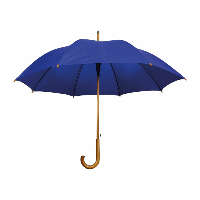 Напівавтоматична парасоля-тростина. Колір куполу: синій. Розміри: довжина 85 см, діаметр куполу 106 см. Матеріал куполу-поліестер. Стержень, ручка та кінчик парасолі зроблені з деревини, механізм стальний. Дерев'яні деталі вкриті лаком, надійні та приємні на дотик.