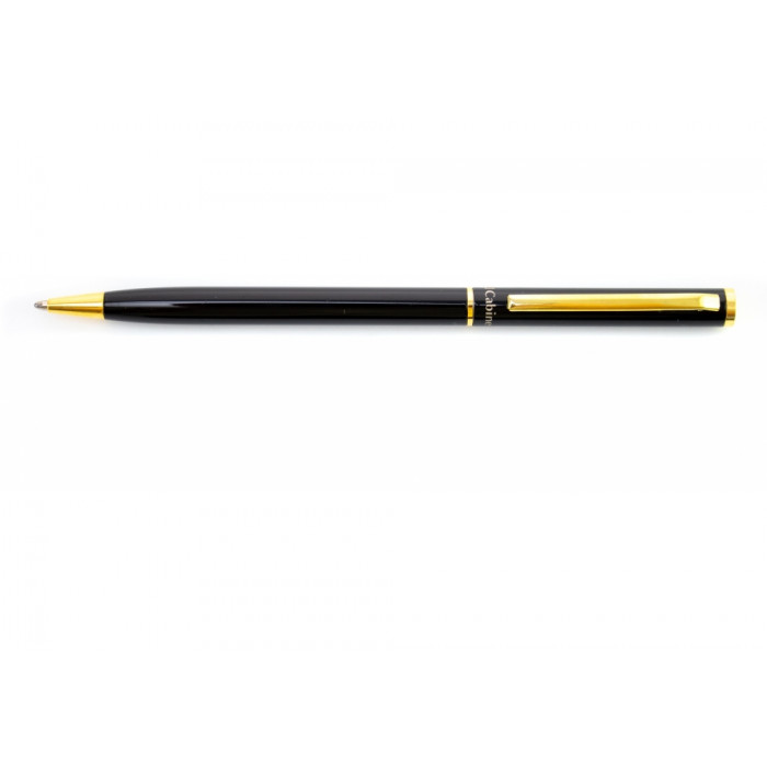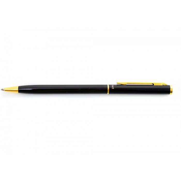 Кулькова ручка з поворотним механізмом; стрижень - тип CROSS; пише синім; довжина ручки 13 см; металевий корпус чорного кольору із сріблястими деталями робить ручку особливо елегантною; в комплекті - подарунковий футляр.