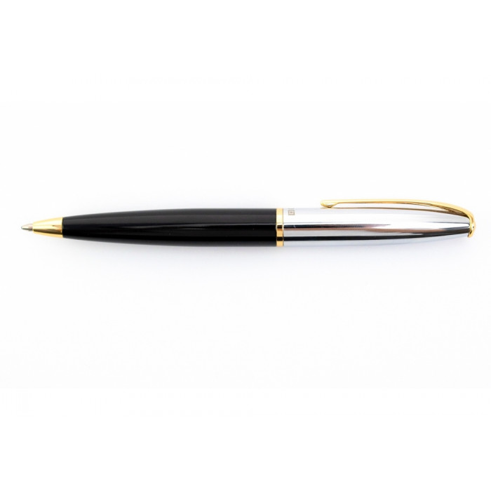 Кулькова ручка з поворотним механізмом; довжина ручки 14 см; стрижень - тип PARKER; чорний металевий корпус з сріблястими та золотистими деталями виглядає особливо елегантно; в комплекті - подарунковий футляр.