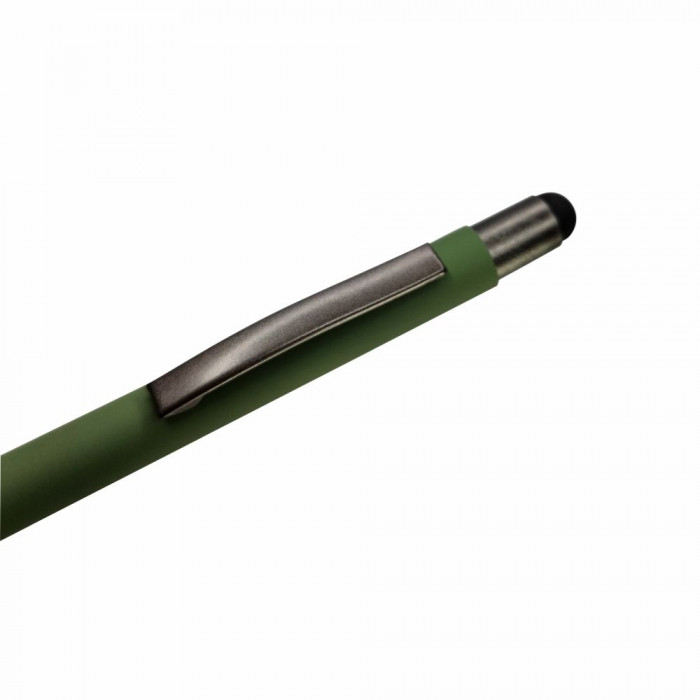 Корпус ручки виготовлений з алюмінію, має гумове покриття. Регулюється кнопкою сірого кольору. На кнопці – чорний стилус для роботи з гаджетами.