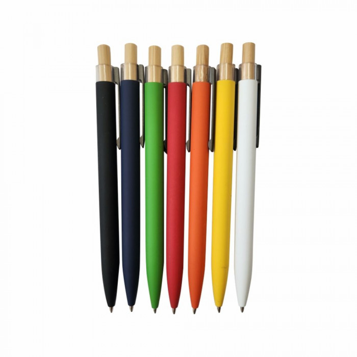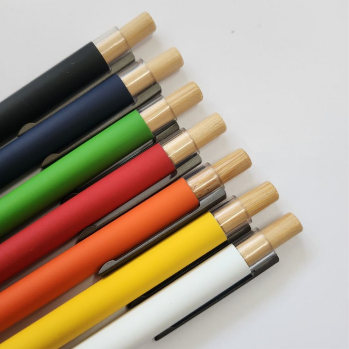 Корпус ручки виготовлений з алюмінію, зверху нанесене кольорове гумове покриття. Виріб має бамбукову кнопку.