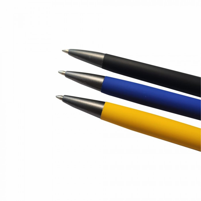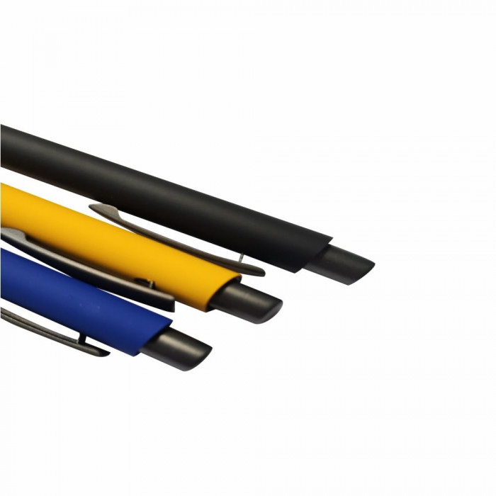 Корпус ручки виготовлений з алюмінію, зверху – кольорове гумове покриття. Виріб має пластикову кнопку.