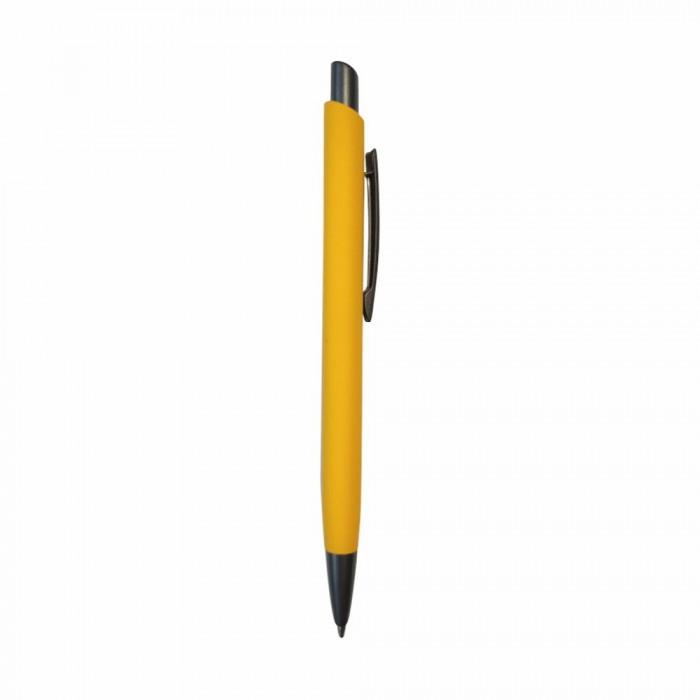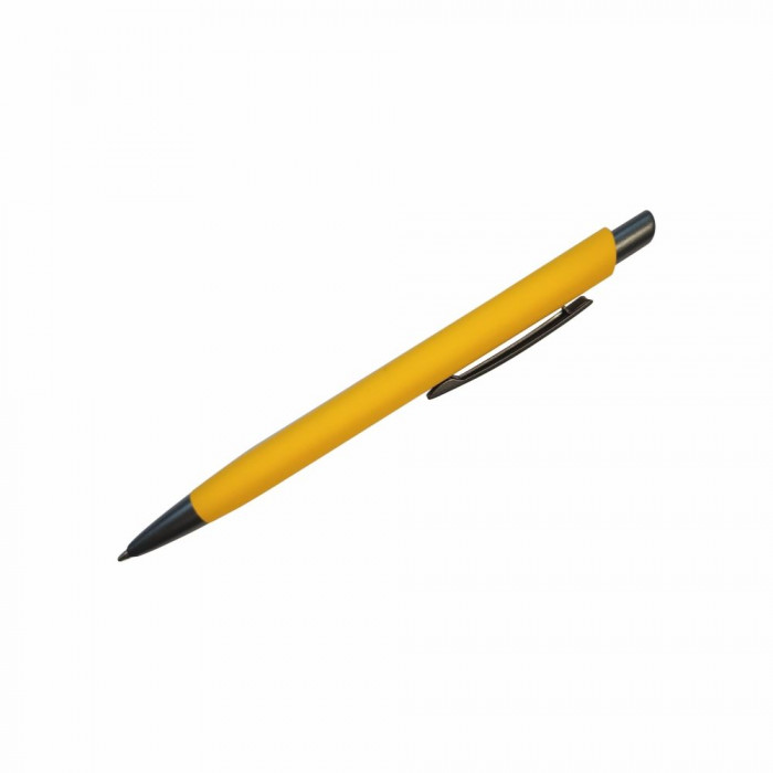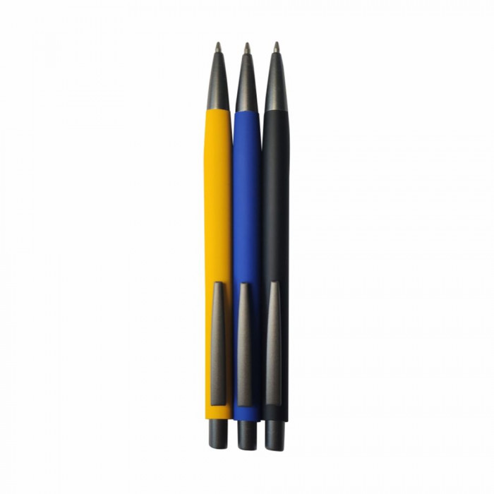 Корпус ручки виготовлений з алюмінію, зверху – кольорове гумове покриття. Виріб має пластикову кнопку.