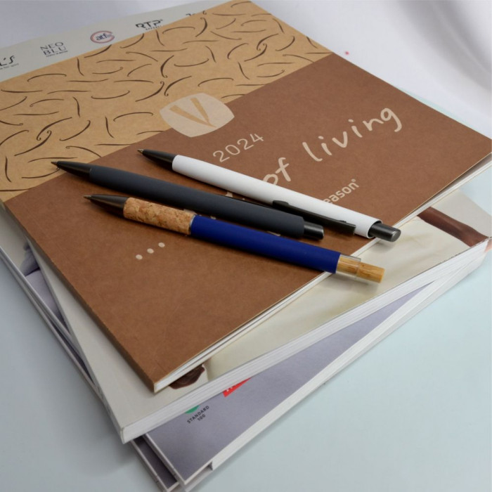 Корпус ручки виготовлений з алюмінію, зверху – кольорове гумове покриття. Виріб має пластикову кнопку.