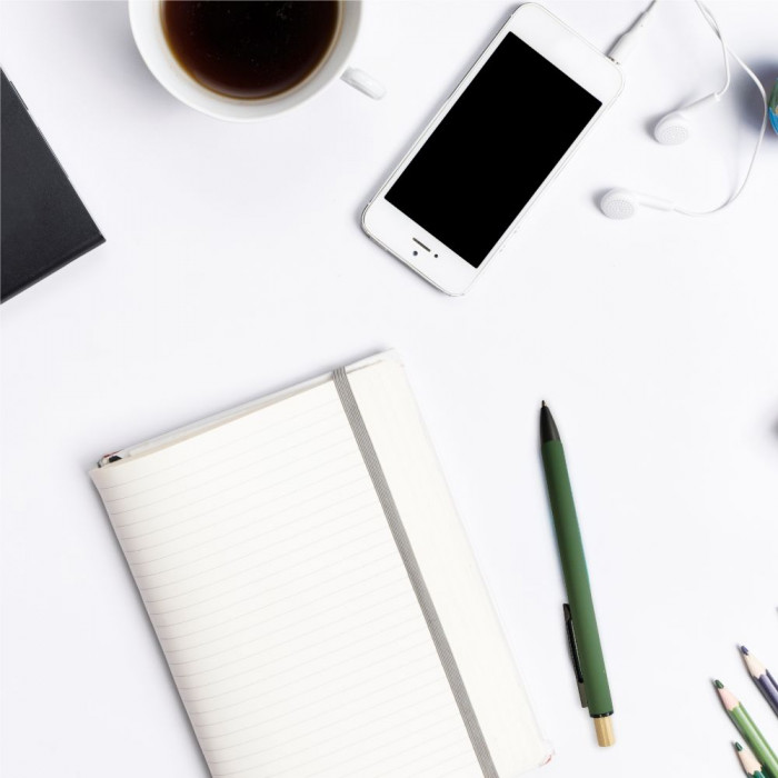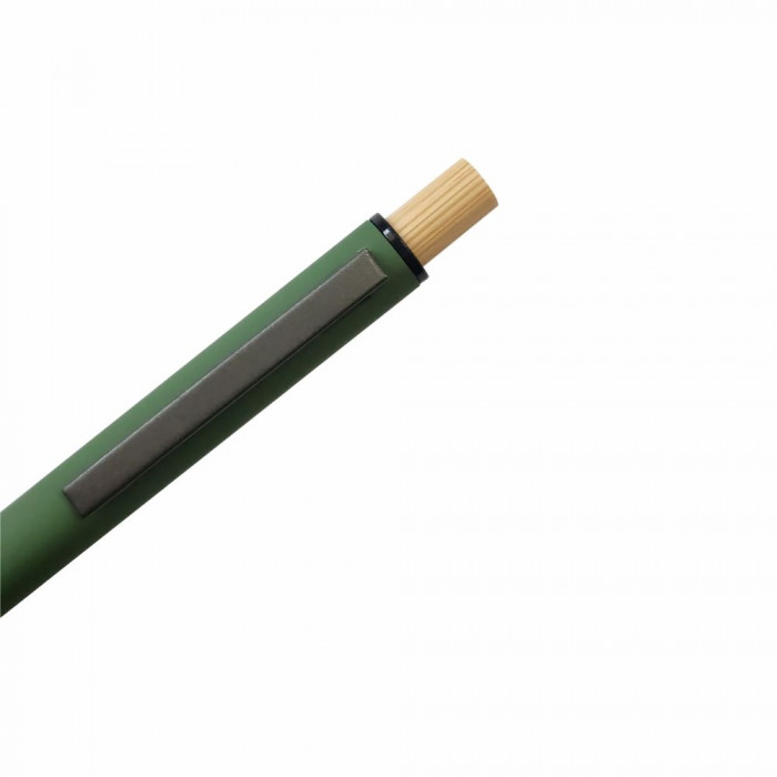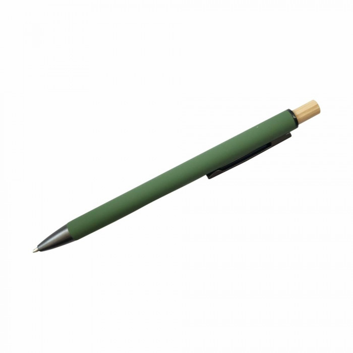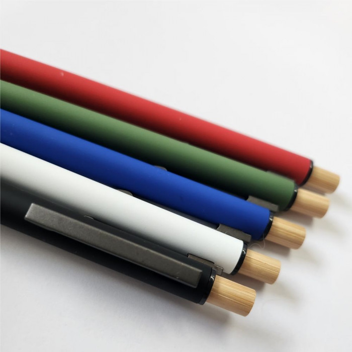 Корпус ручки виготовлений з алюмінію, зверху нанесене кольорове гумове покриття. Виріб має бамбукову кнопку.