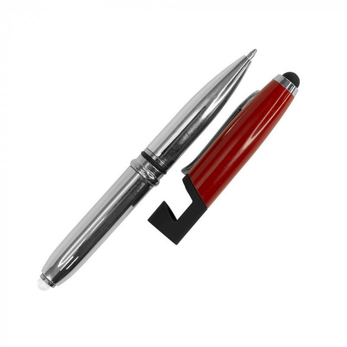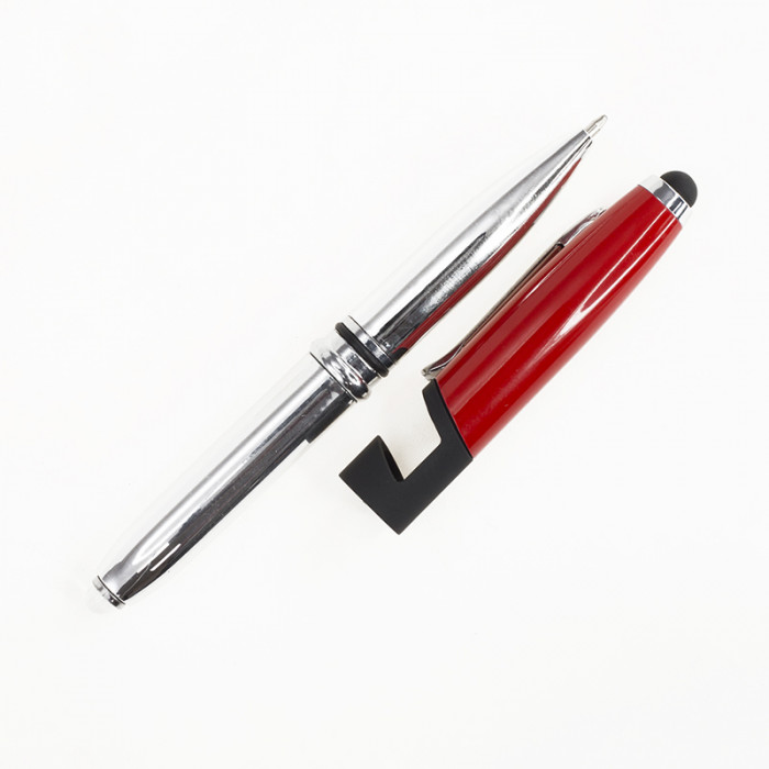 Мульти функциональная ручка - фонарик, стилуса и держателя для смартфона. Цветной металлический лакированный колпачке оборудован стилусом и держателем смартфона, ручка выполнена из пластика и покрыта хромом, на одном кончике ручке расположен яркий светодиодный фонарик, удобный для поиска мелочей в сумке, ящике или бардачке машины. Цвет гравировки колпачка - серебро. 127 мм.