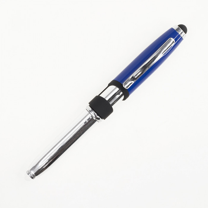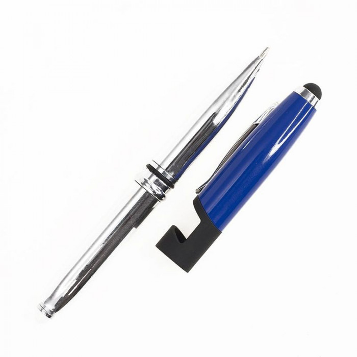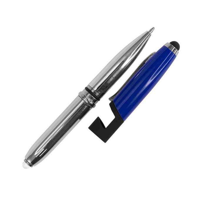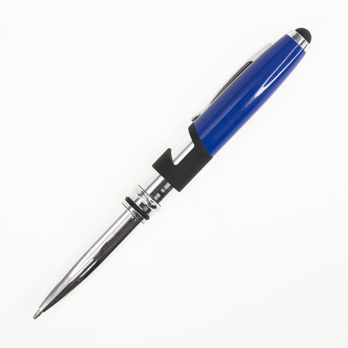 Мульти функциональная ручка - фонарик, стилуса и держателя для смартфона. Цветной металлический лакированный колпачке оборудован стилусом и держателем смартфона, ручка выполнена из пластика и покрыта хромом, на одном кончике ручке расположен яркий светодиодный фонарик, удобный для поиска мелочей в сумке, ящике или бардачке машины. Цвет гравировки колпачка - серебро. 127 мм.