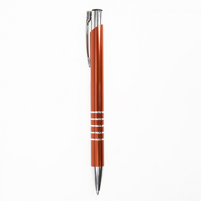 Металлическая анодированная алюминиевая ручка, кнопочный механизм, металлический хромированный клип-кнопка, 5 колец на зоне захвата, хромированный носик, цвет гравировки - серебро. 136 мм.
