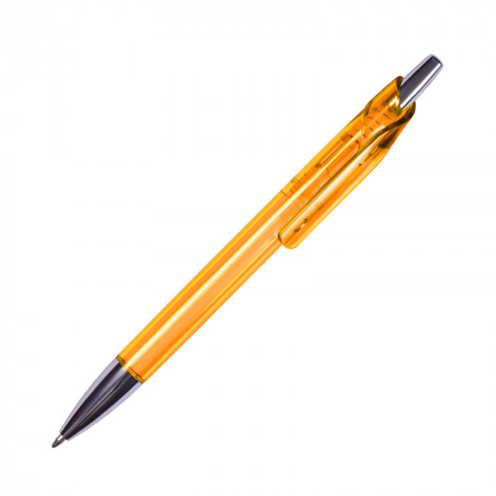 Яркая шариковая ручка из полупрозрачного глянцевого цветного пластика, с серебристым носиком.