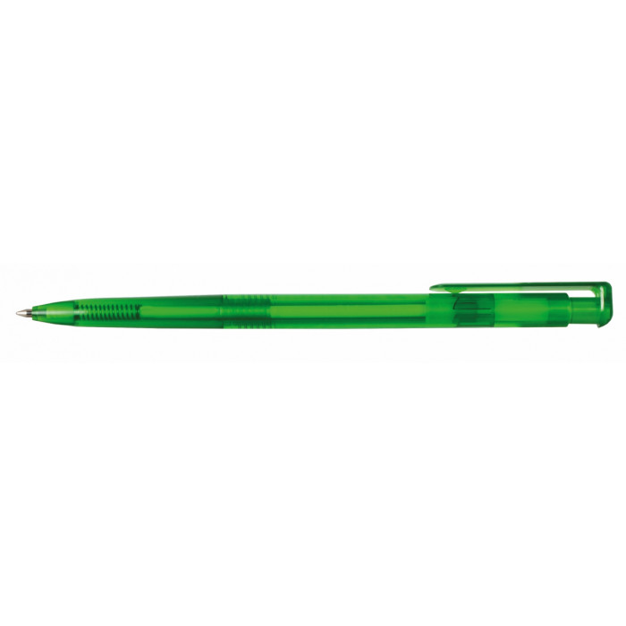 Автоматическая шариковая ручка из прозрачной пластмассы с глянцевой поверхностью; толщина линии 0,5 мм. Стержень 107 мм.