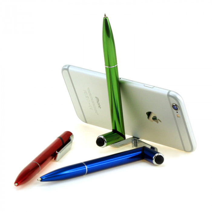 Идеальная ручка для торговых представителей и мобильных презентаций. Уникальная конструкция металлической шариковой ручки позволяет использовать её как подставку для смартфона. На кончике ручки расположен стилус для сенсорных дисплеев планшетов и смартфонов. Поворотный механизм предотвращает случайное нажатие в кармане. Цвет гравировки - серебро.