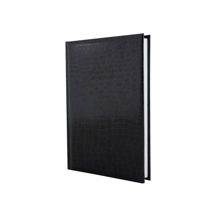 Ежедневник датированный, А5, Croco. Материал балакрон, фактура под кожу крокодила. Подходит для любого вида тиснения. Обложка не меняет цвет при тиснении. Формат: А5 Количество страниц – 320. Информационный блок – 9 страниц. Телефонная книга. Цвет бумаги блока – белый. Цвета печати – синий и черный. Закладка – шелковая лента синего цвета.