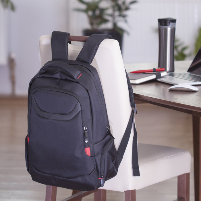 Рюкзак для ноутбука 15''. Одне велике відділення з розділювачем для ноутбука, 2 бокові кишені для дрібних речей, одна кишеня попереду. М'яка спинка з прихованию кишенею та лямки з пасивною системою вентиляції. Ущільнена м'яка підкладка.