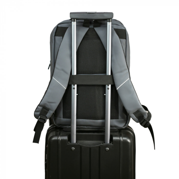 - Зручна спинка має еластичний ремінь для фіксації рюкзака на ручці валізи. Модель обладнана м’якою ручкою та ручкою-петлею.