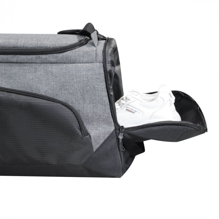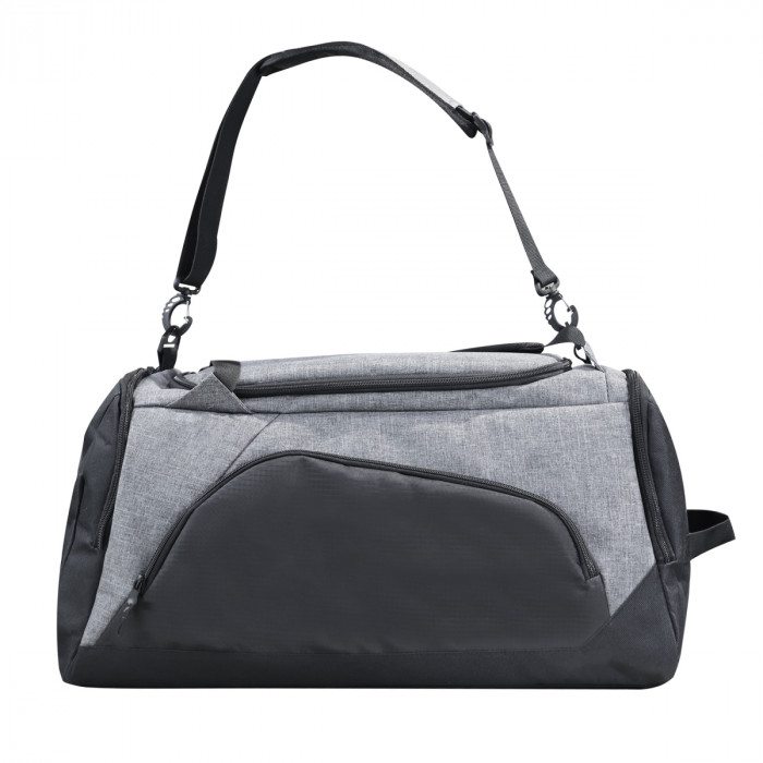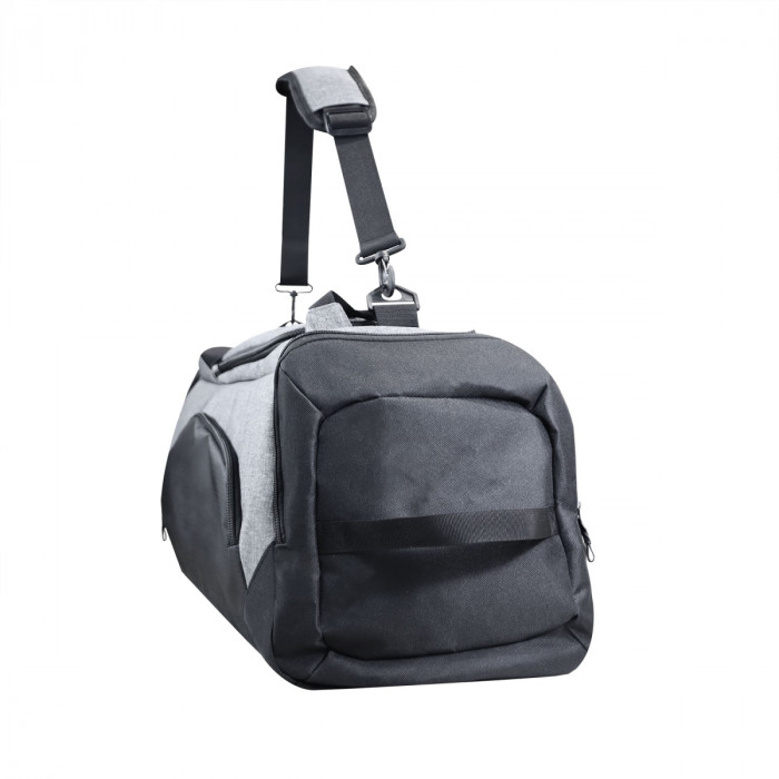 Багатофункціональна сумка з ущільнювачем з поролону. Має вмістке основне відділення, внутрішній м’який карман для ноутбука, дві бокові кишеня на блискавці (одна з яких для взуття), маленьку зовнішню кишеню на блискавці для окулярів, зовнішню кишеню-сітку для пляшки, основний регульований ремінь та дві регульовані наплічні шлейки. Підходить для спорту чи подорожей. Матеріал: Поліестер 600D + нейлон.