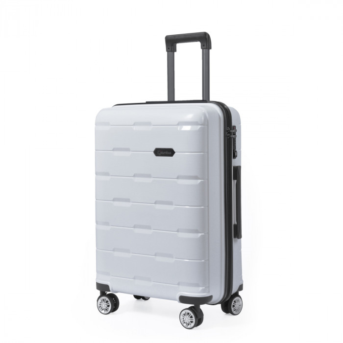 Надлегка та міцна валіза на 8-ми (4х2) колесах TM Columbus. Оснащена кодовим замком системи TSA, телескопічною алюмінієвою ручкою з фіксаторами. Всередині обшита тканиною, має 2 відділення, що розділяються діафрагмою та кишеню на блискавці для дрібних речей; еластичні паски для фіксації речей.