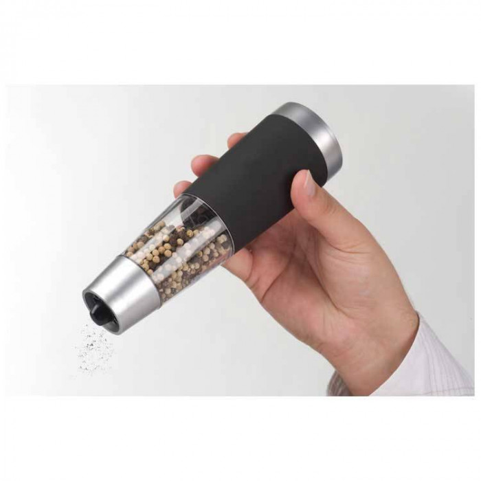 Электрическая мельница для перца конусообразной формы. Обтянута тонким резиновым слоем, позволяющим комфо пользоваться им. Реклама на нижней части корпуса.