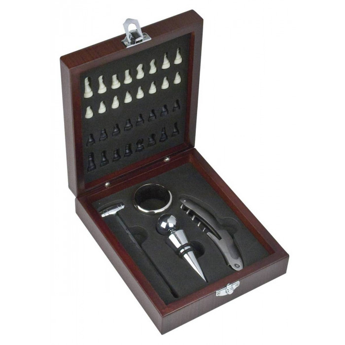 Этот набор состоит из: ножа бармена (штопор с функцией отрывания бутылок и маленьким ножом), воротниак на бутылку, пробки для бутылок и термометра. Всё это в декоративной деревянной упаковке. Группа нанесения: S1/L3