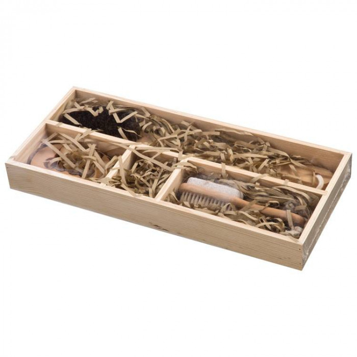 Деревянный ванный набор состоит из: щётки с длинной ручкой, малой щётки с пумексом и аппарата для масажа. Группа нанесения: ЕТ