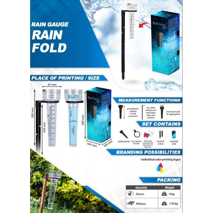Дощомір версії RAIN FOLD також постачається зі складною пластиковою паличкою з ручкою (з нанесеними цифрами, що вказують дні та місяці вимірювання дощу), 2 білими індикаторами для позначення дати вимірювання на паличці та картонною коробкою для зручного перерозподілу.