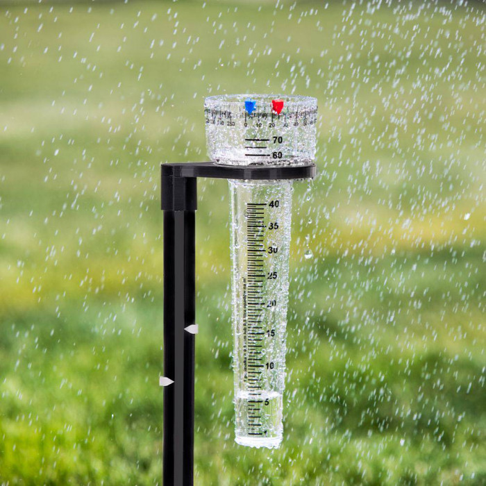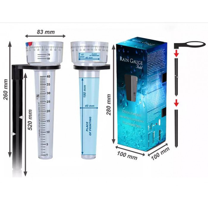 Опадомір RAIN FOLD для вимірювання кількості опадів в комплекті з індикаторами-суматорами виготовлений з полістиролу, преміальна версія також упакована в коробку. Наш опадомір має запатентований суматор дощу, який дозволяє вам вільно підраховувати кількість опадів за тиждень, місяць або рік. Суматор у вигляді двох індикаторів дозволяє фіксувати загальну кількість опадів до 250 мм (250 л/м²). Опадомір виготовлений з полістиролу і має друковану вертикальну шкалу до 40 мм з точністю вимірювання 0,5 мм опадів і горизонтальну підсумкову шкалу. За індивідуальним замовленням можливий друк грозової шкали для сильного дощу до 70 мм.