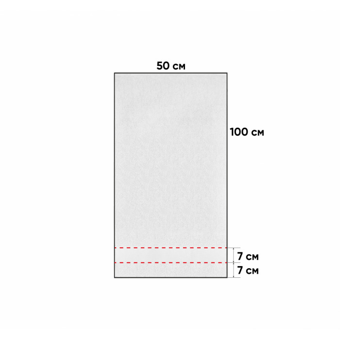 Рушник 100% бавовна, щільність 450 г/м2., розмір 50Х100 см.. Кількість у ящику 25шт., індивідуальна упаковка, поліетиленовий пакет. Подвійна стрічка на загибі, функціональна петля. По одному краю полотенця є гладкий бордюр для нанесення логотипу, ширина бордюра 7 см.